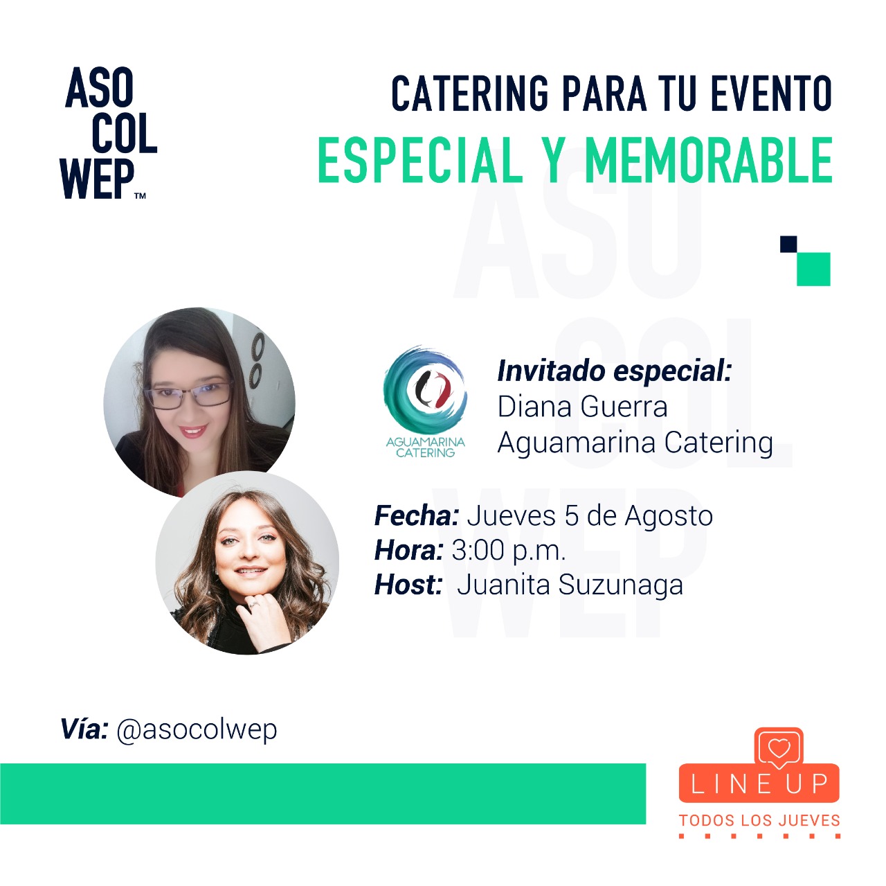 Los invitamos a que nos acompañen el día de mañana al Line Up-Catering para tu evento especial y memorable con nuestra invitada especial y miembro ASOCOLWEP Diana Guerra de Aguamarina Catering vía Instagram live de nuestra cuenta.